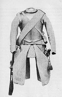 As the Swedish army camped in Saxony in 1706–1707, foreign visitors reportedly claimed that they had never before seen such fine and warlike troops, referring to the Drabants.[64] In 1717, back in Sweden after many campaigns, the Drabants again received new uniforms: the hats were adorned with 11 [Swedish] quarters (163 cm) of gold lacing and had a button similar to the ones in the coat; the coat had 28 gilded buttons while the camisole had 31 smaller buttons; the collars of the gloves, which no longer had any gold lacing, were made of thick oxhide while the grip was still made with buckskin; the waist belts were now also made without any gold lacing.[65]