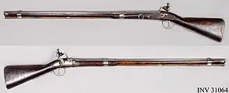 At the outbreak of the war, the Drabants were armed with a pair of pistols and a foreign flintlock carbine that was at least 15 years old.[55] In 1703, a new set of Swedish-produced Drabant carbines arrived along with the new swords, using a French flintlock mechanism; m/1699 was 120,5 cm long and weighed 3,28 kg, it had a 86,5 cm long smoothbore barrel with a calibre of 19 mm. In contrast to many other Swedish firearms, it came with a reversible frizzen, as an extra safety measurement during transport.[56] The new carbine-model, which had an effective range of approximately 30–35 m, cost at least 7 1/3 silver dollars and would be used thereafter. The carbine was secured by an iron hook, attached to the carbine belt.[57]