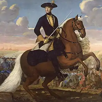 On 1 January 1700, Charles XII replaced 42 elderly Drabants with younger lieutenants, second lieutenants, cornets, NCOs and privates from other regiments.[c][13] On 28 July, he made himself the commanding officer (entitled captain) over the corps, while the previous lieutenant colonel, Carl Nieroth, became the commanding officer of another regiment. The second-in-command (entitled captain lieutenant), Arvid Horn, was promoted to major general over the cavalry.[15][16] An additional 53 Drabants were dismissed on 18 September,[17] while the six vice-corporals were promoted to corporals.[18] The actual size became one commanding officer, one captain lieutenant, two lieutenants, one quartermaster, one adjutant,[1] and 12 corporalships (each with one corporal and 12 common-Drabants);[3] in total, 150 common-Drabants and 18 men of higher ranks (including Charles XII).[4] The corps had no military colours or standards.[19] Until 1716, the corps' official name was: "Kongl. Maij:tz Drabanter" (Royal Majesty's Drabants); it was also frequently called the "Guarde de Corps till häst" (Guard Corps of Horse), and less frequently the "Lif-Drabante-Corpsen" (Life Drabant Corps).[20][21]
