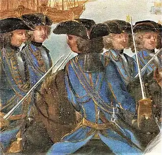 All Drabants had an officer ranking:[33] The rank of the captain lieutenant was made equal to that of a major general, admiral or Landshövding (governor); the Drabant-lieutenants had a rank comparable to a colonel; the Drabant-corporals had a rank next to a major; the adjutant and quartermaster had a rank equal to that of a lieutenant colonel; the commoners had a rank similar to that of a ryttmästare (captain) in the Life Regiment of Horse, or a captain in the Life Regiment Dragoons.[16][28] Evidently, only the officers from other regiments could be commended to the corps, as long as they were experienced, capable and brave.[34][35] These changes made the corps "unlike anything else seen in Europe", according to Jöran Nordberg.[14][36]