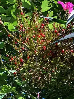 A medium sized tree often reaching 20 m (66 ft) in height, sometimes up to 30 m (98 ft), with width up to 30 cm (12 in) in diameter. The stem tend to be yellowish brown when young but greyish when mature.[3] Leaves commonly exceed 40 cm (16 in) in length, sometimes reaching up to 150 cm (59 in), and width often exceeds 4 cm (1.6 in) reaching up to 10 cm (4 in) in width; leaves are narrowly oblanceolate in outline.[3] Inflorescence arranged in pendulous panicles, flowers bunched in groups of 3 to 5 and at the end of branches.[3]