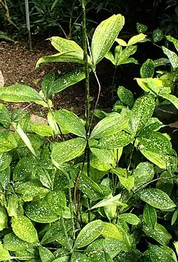 Dracaena surculosa, called the gold dust dracaena and spotted dracaena, is a species of flowering plant in the family Asparagaceae, native to west and west-central tropical Africa, from Guinea to the Republic of the Congo.[2][1] Its cultivar 'Florida Beauty' has gained the Royal Horticultural Society's Award of Garden Merit.[3]