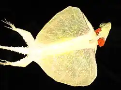 - Patagium: Female - lower half red. Upper half black. Stippled with white and yellow broken lines and spots. Supported by 5 ribs on each side. Greyish upper side and orange lower half in juveniles.