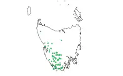 D. milliganii is endemic to western and south-western Tasmania.[3] Found in alpine areas above 850 metres altitude, but can survive lower altitudes in its rainforest form.[2] It is found in harsh, open alpine sites on peaty or well-drained rocky soils in areas of regular snow lie. Along with Isophysis tasmanica its presence is useful in determining communities of Tasmanian highland treeless vegetation, as it appears in western alpine heathland (HHW) and cushion moorlands (HCM).[4]