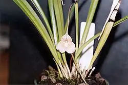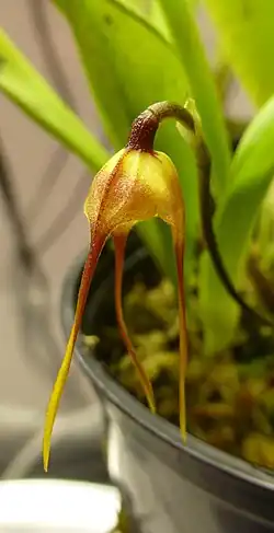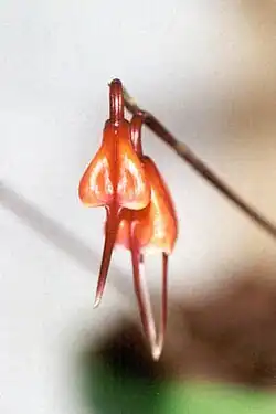 The flower stalks grow either horizontally from the base of the plant or descend, often for great distances. A few species grow upright flower stalks. The long-tailed terminal flowers are basically triangular. The flowers are borne singly or successively. Three species (sodiroi, decussata/neisseniae, and papillosa) may have up to three simultaneously open flowers on a single stalk. In general, though, if there is more than one flower bud on the raceme, they open up with long intervals. These flowers have a weird aspect, due to the long tails on each sepal. The petals are small and somewhat thickened. Quite commonly, various species of Dracula are known for blooms resembling the faces of primates, a notable example being Dracula simia. However, this likeness to monkeys' faces seems to be purely a natural coincidence to the primates living in the same forests. In fact, these flowers are pollinated by the common fungus gnat;[5] the bloom's lip is often quite large (for a Pleurothallid), and from the fungus gnat's perspective, resembles an irresistible mushroom or fungus. Research by biologists at the University of Oregon indicates that D. lafleurii also possesses a uniquely volatile chemistry, similar to localized species of mushrooms. This mimicry attracts mushroom-associated flies which play a role in pollination.[6] The basal part of the lip (hypochile) is cleft. The terminal part (epichile) is rounded and concave. The margins of the perianth are often fringed. There is a well-developed column with two pollinia.