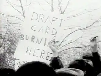 Draft-card burning was a symbol of protest performed by thousands of young men in the United States and Australia in the 1960s and early 1970s as part of the anti-war movement. The first draft-card burners were American men participating in the opposition to United States involvement in the Vietnam War. The first well-publicized protest was in December 1963, with a 22-year-old conscientious objector, Gene Keyes, setting fire to his card on Christmas Day in Champaign, Illinois.[1] In May 1964, a larger demonstration, with about 50 people in Union Square, New York, was organized by the War Resisters League chaired by David McReynolds.[2][3]