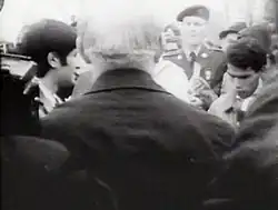 On October 15, 1965, David J. Miller burned his draft card at a rally near the Armed Forces Induction Center on Whitehall Street in Manhattan. He spoke briefly to the crowd from atop a sound truck and then tried but failed to burn his card with matches—the wind kept blowing them out. The crowd offered a lighter, and it worked. Miller was arrested by the FBI three days later in Manchester, New Hampshire, while setting up peace literature on a table.[5] The 24-year-old pacifist, member of the Catholic Worker Movement, became the first man convicted under the 1965 amendment.[20] In April 1966 with his wife and breast-feeding baby in attendance, he was sentenced to 30 months in prison.[20][21] The case was argued in the United States Court of Appeals for the Second Circuit in June. Miller's attorney held that "symbolic speech is protected by the First Amendment; burning a draft card is a most dramatic form of communication, and there is a constitutional right to make one's speech as effective as possible."[22] The court did not agree. The case was decided later that year in October: Miller's conviction was confirmed, and his sentence upheld.[23] Loudon Wainwright Jr. wrote in Life magazine that Miller, "without really knowing it, might be embarking on a lifelong career of protest."[24] Miller remained free on bail until June 1968 at which time he served 22 months in federal prison.[5]