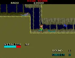 The game has side-scrolling platform gameplay and an overworld map similar to the later platform games for home consoles and personal computers.[6] Dragon Buster was also the earliest game to feature a double jump mechanic,[7] and one of the first to use a visual health meter.[4]