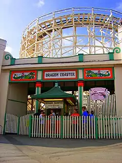 The Dragon Coaster is a wooden roller coaster at Playland amusement park in Rye, New York. Opened in 1929, it was designed and built by amusement ride creator Frederick Church,[1] the co-inventor of the Racing Derby, another early 20th century amusement park ride. The Dragon Coaster has approximately 3,400 feet of track and is, at its highest, approximately 80 feet tall. There is a tunnel along its span, a common feature of wooden roller coasters from the 1920s, that resembles the body and open mouth of a dragon. It was featured in the film Fatal Attraction,[2] the Tom Hanks starring film Big, and the music video for Mariah Carey's song "Fantasy". The Dragon Coaster is still in operation.