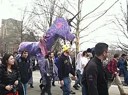 Although it is typically carried from beneath by architecture students, in 1964 and 1976 the dragon was mounted on a car and driven through the route. In 1985, the dragon fell over as it rounded Sibley Hall, and was not able to complete its route. In 2009, due to new New York State Department of Environmental Conservation regulations,[3] the dragon was not burned at the end of the parade route; the dragon's "nest" was burned instead. Since the dragon can no longer be burned, various tactics have been employed to create a climactic spectacle. In 2012, first year architects squirted the dragon with paint. And in 2013, the white dragon was colored with multicolored Holi powder throughout the parade and at the Arts Quad finale.[4]