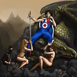 The single cover for "Dragon Slayer" was painted by London-based artist Katie Scott. The artwork, originally posted by Scott on her Facebook page in November 2013, features Danny Sexbang sitting on a dragon corpse, holding a bloodied sword with two half-naked girls sitting at his feet. Ninja Brian stands in the background holding a pocket knife.[1] She had previously created the artwork for British alternative rock band Bombay Bicycle Club's third studio album A Different Kind of Fix.[2]