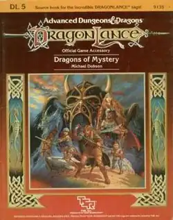 Dragons of Mystery is a Dungeons & Dragons sourcebook published in 1984 as part of a series of modules for the Dragonlance (DL) campaign setting. It is the fifth of fourteen Dragonlance modules published by TSR between 1984 and 1986. Its cover features a painting by Larry Elmore of the characters Tanis Half-Elven, Laurana Kanan, Tasslehoff Burrfoot, and Tika Waylan standing in front of a dragon highlord and a blue dragon. The sourcebook received middling reviews from White Dwarf magazine.
