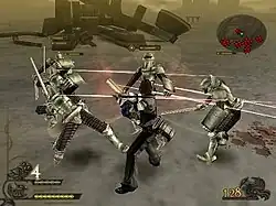 Drakengard is an action role-playing video game featuring three types of gameplay: ground missions, aerial missions, and Free Expedition Mode.[1] The gameplay modes are called Ground Mode, Strafe Mode, and Air Mode.[2] In some levels, players can switch between ground-based and aerial combat.[3] Ground-based gameplay primarily has the player controlling the main protagonist, Caim. He has access to three types of attack: a standard sword-slash, a magic attack and a dash attack that throws enemies to the ground.[1] Additional weapons can be accessed and swapped via the menu. Weapons gain experience levels through use, dealing more damage as a result. Each has a four-level cap. The player can access up to eight weapons during a mission.[2][4] Pressing the attack button repeatedly while in combat with enemy units triggers combos, and pressing another button mid-combo will trigger a special attack which will temporarily incapacitate enemy units in the immediate area. The player can also temporarily switch between Caim and an assigned ally, who shares similar attacks but deals more damage.[4] These allies are gained in optional levels and can only be summoned a limited number of times.[5]