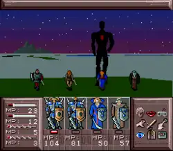 Drakkhen's gameplay is colored by its early-game brutality and surreal enemy encounters, the former especially in the SNES version. One special enemy is relegated solely to appearing when the player kicks one of the many urns in the ground. Upon doing so, a black, stationary canine head rises from beneath the floor to shoot bolts from its eyes. These encounters are quickly fatal to new players who don't know any better.[2] They offer no experience points, suggesting that kicking an urn is frowned upon. Another difficult enemy is the "Shadow Man", a tall figure that can unexpectedly lift itself out of the ground, accompanied by an ominous tune. Each enemy has movement and attack differences, some being less subtle than others, such as enemies that zigzag sporadically at a much greater speed than the player's party can keep up with. The game contains over one hundred different enemy variants.[3]