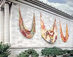 In the 1970s, he created larger and more immersive Drapes including metal, rocks, wooden beams, ladders, and sawhorses in the environment, sometimes draping or piling canvases over the objects instead of suspending them from above. One of his largest and most well-known works, Seahorses, was a draped installation created for the Philadelphia Museum of Art as part of a city-wide festival in 1975. Inspired by the large bronze rings that decorate the top of the museum's building, which Gilliam said had made him imagine Neptune using them to tie seahorses to his temple, the work consisted of six monumental painted canvases, two measuring 40 x 95 ft and four measuring 30 x 60 ft, hung from their respective top corners on the outside walls of the museum, attached via the rings and drooping down in upside-down arches of folds. In 1977 he reinstalled the work with five canvases instead of six, on the outside of the Brooklyn Museum.[24]