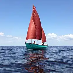 David Pyle sailed his wooden Drascombe Lugger Hermes from England to Australia during 1969 and 1970.[12] This was possibly the longest journey ever undertaken in a small open sailing boat (though, later, in 1991, a complete circumnavigation was completed by Anthony Steward in an open 19' boat[13]). Hermes was a standard production model with the exception of a raised foredeck and a few other minor modifications. The boat was built at Kelly and Hall's boatyard at Newton Ferrers by John and Douglas Elliott.[14]
