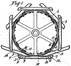 An Australian blacksmith and engineer, Frank Bottrill (1871–1953),[9] after a failed endeavour using wheeled traction engines in outback Australia, and becoming aware of the Boydell wheel, decided to improve the design.[1][6] In 1907 he patented an "improved road wheel for travelling, useful for traction engines". Bottrill's design used two rows of overlapping rails fastened to the rim with cables to smooth the transition from rail to rail.