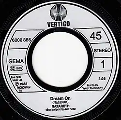 "Dream On" is a song recorded by the Scottish rock band Nazareth, and released on the studio album 2XS in 1982, and later as a single in early 1983. Initially written by Billy Rankin and recorded as a demo in 1979, with an additional verse being penned by Manny Charlton in 1982 during the recording of 2XS, "Dream On" became one of their most popular tracks. In 1987 Helix covered this song and it appeared on their album, Wild in the Streets.[2]