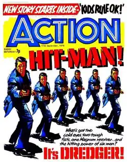 "Dredger" is a British comic action story published in the weekly anthologies Action and Battle Action from 14 February 1976 to 7 October 1978 by IPC Magazines. The strip focused on the eponymous, uncompromising secret agent and his partner Breed, featuring self-contained stories that featured Dredger getting out of lethal situations with an innovative and violent approach.