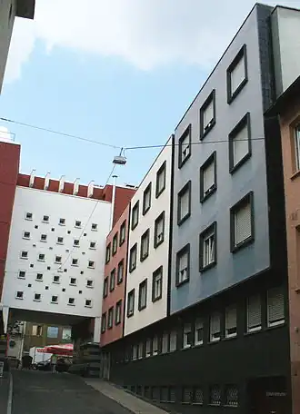 After the war, prostitutes started to use the ruins to meet their clients; they became known as the "rubble prostitutes".[1][2][4] Following complaints, the city fathers wanted to rid the streets of prostitutes.[4] Although opposed by 46 local businessmen, Lord Mayor Arnulf Klett issued building permits to build 4 "dormitories" on the site.[1] Three investors built 3 of the buildings and gave over the management of them to a French couple.[1][2] The fourth "dormitory" was never built.