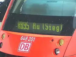 The DreiLänderBahn predominantly operates on non-electrified branch lines. As a result, it uses modern diesel multiple units exclusively. Its vehicle fleet includes Alstom LHB Coradia LINT units of DB Classes 640 (LINT 27) and 648 (LINT 41),[1] which offer comfortable seats with armrests and tables in the 1st class accommodation, a video surveillance system and two multi-purpose compartments (e.g. for bicycles or prams). Large windows provide make the interior very light. By contrast, legroom is less than in the older, more traditional Silberling coaches. The DreiLänderBahn also offers a taxi service for connexion to the station. The DreiLänderBahn's multiples are filled at Finnentrop, Dillenburg and Siegen, where they are also cleaned externally.