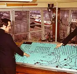 The engineers dealt with this problem as part of the comprehensive modernisation of the marshalling yard between 1928 and 1935. A rope shunting system for maintaining a controlled flow rate was installed from October 1928.[11] The rope shunting system consisted of one cable wagon each for each of the four cable haulage tracks that ran on narrow gauge tracks laid between the rails (Chemnitz Hilbersdorf marshalling yard based on this system). Two of them were connected together by a cable that ran over a pulley in the drive house on top of the hump. After the wagons were towed up the hump, the locomotive was separated and the wagons were coupled to cable wagons. When each cable wagon ran downhill, the other cable wagon it was connected to by cable was hauled up the hill.[10] The control of the machines hauling the cables in the control building was taken over by the new electro-mechanical signal box 20, so that the flow rate of wagons could be regulated. Built on a bridge above the tracks, it had a good overview of the hump and replaced the former mechanical signal box 20. Subsidiary signal boxes A–G took over control of the main distribution points.[8] In addition Deutsche Reichsbahn built several tracks covered by coarse-grained sand to stop wagons that had got out of control. These tracks still exist today.