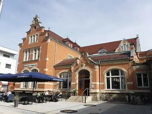 Dresden-Strehlen railway station opened in 1903 to serve as a haltepunkt. The station's design was commissioned by Royal Saxon State Railways at a cost of 56,656 Marks.[3] Architect and painter Bernhard Fellmann completed a watercolor of the station in 1980. Today, the painting is a part of Museum für Sächsische Volkskunst's collection located in Dresden.[4] The station's building was bought by a consulting firm in 2017 and proceeded to refurbish the structure to house their IT professionals. The building also includes a restaurant, public transit facilities, and an event space.[5]