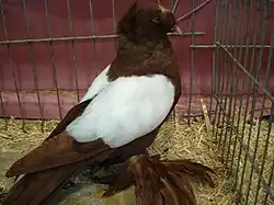 Only slightly sturdier than the Field Pigeon, low carriage, a rather long than short effect required. White wing shield. Double-crested.