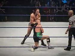 On 26 April, McIntyre was drafted to the Raw brand as part of the 2011 supplemental draft.[56] On 15 December episode of Superstars, McIntyre defeated Justin Gabriel, earning him a contract with SmackDown.[57] He began wrestling on SmackDown on 30 December and resumed his tense relationship with general manager Theodore Long, who put pressure on McIntyre to win matches to justify his contract. McIntyre subsequently began an eight match losing streak going into the new year,[58] after the last of which, Long fired McIntyre within the storyline.[59] A week later, McIntyre was reinstated by guest general manager John Laurinaitis and ended his losing streak by defeating Hornswoggle.[60] He was subsequently included on Laurinaitis' team in the 12-man tag team match at WrestleMania XXVIII on 1 April, helping to earn Laurinaitis control of both Raw and SmackDown.[61] He continued to lose matches and was confined to Superstars and house shows, but still made appearances on Raw and SmackDown, albeit in squash matches.