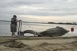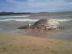 In historical sources, it is not always clear whether a given cetacean washed up alive or dead, but the term "drift whale" focuses on the benefits of its carcass – meat, blubber, fat, and other products – to the people who claimed it.[1] Nowadays, when a dead whale washes up on a beach, often the authorities are required to dispose of it as a potential hazard to human health, so the resource implications go the other way: a drift whale is no longer a benefit to a community, but an expensive disadvantage.[2]