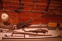 A quarry bar consists of a rock drill mounted to a long rod, such that the rock drill may be moved along it. This tool is used in quarrying to produce a straight row of holes, such as for use with the plug and feather to split the stone along the given line.[1]