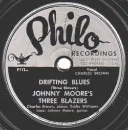 "Driftin' Blues" or "Drifting Blues" is a blues standard, recorded by Johnny Moore's Three Blazers in 1945. The song is a slow blues and features Charles Brown's smooth, soulful vocals and piano. It was one of the biggest blues hits of the 1940s and "helped define the burgeoning postwar West Coast blues style".[1] "Driftin' Blues" has been interpreted and recorded by numerous artists in various styles. The Blues Foundation Hall of Fame and the Rock and Roll Hall of Fame have acknowledged the influence and lasting popularity of the song.