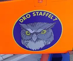 The Drohnesstaffel 7 is a Militia squadron, stationed on the Militärflugplatz Emmen and is under the drone command 84 (Dro Kdo 84). Drohnesstaffel 7 has as Coat of arms a round badge that shows the head of an owl against a dark blue background and the yellow inscription "Dro Staffel 7". It is the only UAV squadron of the Swiss Air Force. The owl symbolizes the good sight of the UAV sensors by day and night.