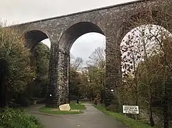 Immediately to the west of the station is Dromore Viaduct, which once carried trains across the River Lagan. At 74 ft tall and 7 arches long, it was the most noteworthy piece of engineering on the line.