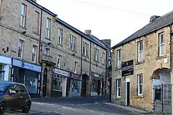 Following significant population growth, largely associated with the coal mining industry, a local board of health was established in Dronfield in 1861.[1] The local board decided to commission modest offices abutting the south side of the High Street close to the corner with Church Street. The three-storey structure, which became known as the Town Hall Buildings, formed part of a terrace of properties designed in the neoclassical style, built in stone and completed in 1877. It featured an elaborate entrance with a round-headed opening flanked by pilasters and brackets supporting a cornice and an entablature inscribed with the words "Town Hall". It was used as a magistrates' court, a mechanics' institute, and a meeting venue. The ground floor has since been converted to retail use.[2]