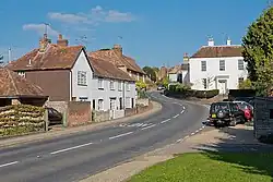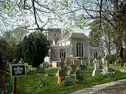 The village is clustered with slight ribbon development along its main, north–south, undulating road. It is entirely on the lower half of the western slopes of the Meon valley. Farms and residential outbuildings stretch to the west, north and south. It is centred around the Church of St Mary and All Saints, a mainly 13th- and 14th-century church with a 1599-built tower, together listed in the highest category for heritage.[3] Next to the church is the old rectory dating from the 18th century.[4] The village is 3.5 miles (5.6 km) east of the nearest town Bishop's Waltham.