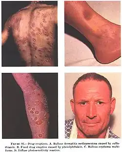 1. ^ Manders SM (June 1995). "Serious and life-threatening drug eruptions". Am Fam Physician. 51 (8): 1865–72. PMID 7762478.