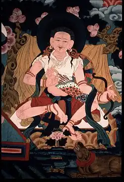 Drukpa Kunley (1455–1529), also known as Kunga Legpai Zangpo, Drukpa Kunleg (Tibetan: འབྲུག་པ་ཀུན་ལེགས་, Wylie: brug pa kun legs), and Kunga Legpa, the Madman of the Dragon Lineage (Tibetan: འབྲུག་སྨྱོན་ཀུན་དགའ་ལེགས་པ་, Wylie: 'brug smyon kun dga' legs pa), was a Tibetan Buddhist monk, missionary, and poet in the Drukpa Kagyu lineage of the Mahamudra tradition.[1] He was trained at Ralung Monastery under siddha Pema Lingpa. However, by the age of 25, he had returned his monastic vows[2] to take a wife, whose name was Tsewang Dzom (tshe dbang 'dzom).[3] He is often counted among the Nyönpa ("mad ones"). He is considered to have been a reincarnation of Saraha.[4]