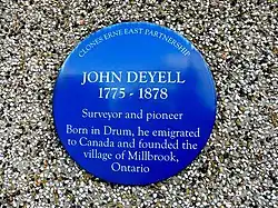 Drum has a Church of Ireland church, one of the oldest Presbyterian congregations on the island of Ireland (although the current Presbyterian church was only built in the c. 1820s[6][7]), a Free Presbyterian church and a Gospel Hall. The village retains a sense of pre-partition Ulster Scots culture. It has a Protestant Hall, which hosts two Orange Lodges and an accordion band, they both host a picnic and march in the village each year. A blue plaque on the wall of the Protestant Hall commemorates John Deyell, who later founded a settlement in Canada. There is also a branch of the Royal Black Preceptory, and the Drum Association, a local development association, which shares premises with the Wee Drummers childcare facility. There is a Protestant primary school, while the nearest secondary school is in Cootehill, a 15-minutes drive away. Drum also participates in the Tidy Towns competition. The village shop and the last local public house closed in the 2010s, and the nearest retail facilities are now in Cootehill.[4][5]