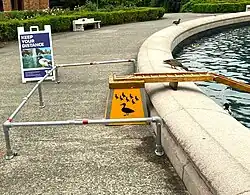 The fountain is utilized by mallards to raise ducklings, and every spring, the university would install a duck ramp to help ducklings enter and leave the raised edges of the fountain. Installed typically in April or May and maintained for approximately a month, the ramp allows sufficient time for the young ducklings to develop their flying skills and venture out of the pond.[4][5] The duck ramp comes after the university's unsuccessful attempts to remove the ducklings and the repeated arrival of additional ducks.[6]