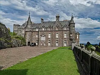 The castle was sacked by the army of Oliver Cromwell in 1653, during the Wars of the Three Kingdoms.[1] James Drummond, 4th Earl of Perth, was Lord Chancellor of Scotland under King James VII. He began the mansion house in 1689, before being imprisoned following the deposition of King James by William of Orange. He later fled to the exiled Jacobite court in France. The Drummonds continued to support the Jacobite cause in the Jacobite uprisings of 1715 and 1745. The family retained control of the estate until 1750, when the Drummond properties were declared forfeit and seized by the Crown. The estate was managed by the Commissioners for Forfeited Estates until 1784, when it was sold to Captain James Drummond (later created 1st Baron Perth). He began a number of improvements that were continued by his daughter Sarah and her husband, Peter Drummond-Burrell, 22nd Baron Willoughby de Eresby (1782–1865). These included the formal gardens and terraces in the 1830s. Queen Victoria visited the gardens in 1842.[1]