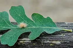 | The gall formed by D. fullawayi on an oak leaf | |