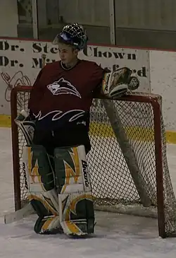 Goalie Graeme Harrington relaxes during a game (2007)