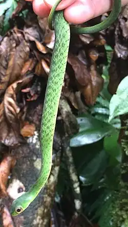 Drymobius melanotropis is green above, with black on the keels of the median three dorsal rows. The green color extends to the outer fourth of the ventral shields, and the center of the belly is yellow. Adults are about 1.25 m (50 in.) in total length.[3]