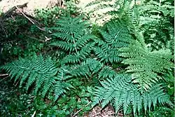 It has a short rootstock. The leaves are with large, green lacy fronds typically 30–120 cm (12–47 in). The petiole is usually about half the length of the leaf blade and brown scaled. The scales are black-ish in the middle. The leaf blade is triangular and sparsely glandular on the underside.[2] The deltate[3] fronds are bipinnate at the base, pinnate toward the apex. The rhizome is erect or ascending, often producing offshoots. Sori occur medially on the underside of the pinnae. Propagation is by spores and vegetatively by division of the rhizome.