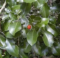 Elliptical, ovate to ovate-oblong in shape, 4 to 9 cm long, 1 to 5 cm wide. Wavy edged, stiff, thick. Margins toothed, without teeth or with scalloped margins. Leaves abruptly tapered at the base, with a leaf tip or rounded at the end. Hairless and glossy green, somewhat paler green underneath. Leaf stems 3 to 6 mm long. Juvenile leaves prominently toothed. Leaf veins easily noticed, raised on both sides of the leaf. Five to seven lateral veins, at around 65 degrees to the midrib.