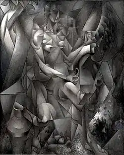 In a review of the 1910 Salon d'Automne the poet Roger Allard (1885-1961) announced the appearance of a new school of French painters who—in contrast with Les Fauves and Neo-Impressionists—concentrated their attention on form rather than on color. A group formed following the exhibition that would include Gleizes, Metzinger, Henri Le Fauconnier, Fernand Léger, and Robert Delaunay (a friend and associate of Metzinger since 1906). They convened regularly at the studio of le Fauconnier where he worked on his ambitious allegorical painting entitled L'Abondance. "In this painting" writes Brooke, "the simplification of the representational form gives way to a new complexity in which foreground and background are united and the subject of the painting obscured by a network of interlocking geometrical elements".[8] But it was Metzinger, a Montmartrois in close contact with Le Bateau-Lavoir and its habitués—including Guillaume Apollinaire, Max Jacob, Maurice Princet, Pablo Picasso and Georges Braque—who introduced to Gleizes and the others of the group, with his Nu à la cheminée (Nu), 1910, an extreme species of 'analytic' Cubism (a term that would emerge years later to describe the 1910–1911 works of Picasso and Braque).
