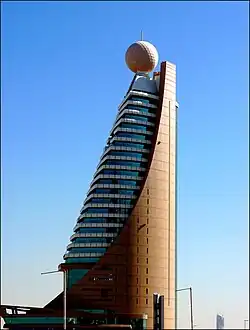 1959 saw the establishment of Dubai's first telephone company, 51% owned by IAL (International Aeradio Ltd) and 49% by Sheikh Rashid and local businessmen and in 1961 both the electricity company and telephone company had rolled out operational networks.[46] The water company (Sheikh Rashid was chairman and majority shareholder) constructed a pipeline from wells at Awir and a series of storage tanks and, by 1968, Dubai had a reliable supply of piped water.[46] The same year, a sand tax was briefly imposed by ruling Sheikh Rashid bin Saeed Al Maktoum, in an effort to boost trade by monetising the Emirate's most abundant resource. The tax was lifted after 11 days, making it the shortest lived tax in the region's history.[47][48]