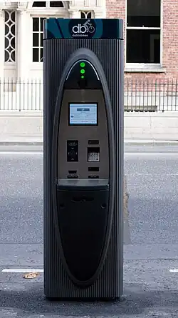 Dublinbikes (styled "dublinbikes") is a public bicycle rental scheme which has operated in the city of Dublin since 2009. At its launch, the scheme, which is sponsored by JCDecaux, used 450 French-made[3] unisex bicycles with 40 stations.[4] By 2011, this had expanded to 550 bicycles and 44 stations, and in 2013 it was announced that a major expansion of the scheme would add a further 950 bikes and another 58 hire points.[5] Dublin was the 17th city to implement such a scheme,[4][6] and it was considered one of the most successful bike-sharing schemes in the world;[7] however, progress later stalled, with only 2 of 14 phases being rolled out.