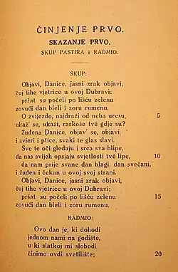 The Dalmatian fisherman is a character that warns about "bad situation in Dalmatia under Venetian rule, the greatest enemy of Dubrovnik, in order to stress better situation in Dubrovnik." Fisherman "emphasizes the fact that Dubrovnik is an independent state ruled by local people with Turkish leadership being only formal with a cost of paying tribute." Free Dubrovnik contrasts with non-free Dalmatia under Venetian rule. Miljenko is against the "gift" for Dubravka, with "gift" perhaps being an allusion to the gifts "that some nobles received from rich citizens for their services" or "the state borrowing money from local rich people".[3] According to Ravlić's opinion, Miljenko was a figure that spoke in a poet's name against "accepting citizens among the nobility, and consequently against the possibility that Grdan should marry Dubravka, i.e. the power into his own hands".[4] Because of the possibility that Gundulić remained isolated in his opinions (as Miljenko on stage), he set problem in the mythical world in order for it to be resolved by gods. Also, Miljenko, due to his uncertainty in the proclamations of love toward Dubravka as his predetermined companion, brings kind of inappropriate dramatic turn to the pastoral. The question is: are Miljenko's words even words of a man who is in love with a woman?[5] Ljubdrag's objurgation of Zagor, because he left his flock and ran away, is an allusion to the economic crisis of Dubrovnik of the time, caused by free citizens fleeing with their possessions and herds, which mostly affected the nobility who lived from estates on which those mercenaries worked.[6]
